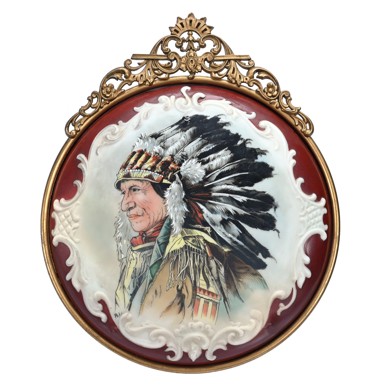 Unmarked Wave Crest round wall plaque, 9 ¾ inches in diameter, with a rare and eye-catching Native American Chief portrait carrying the artist’s initials (“R.L.”). Estimate: $4,000-$6,000.