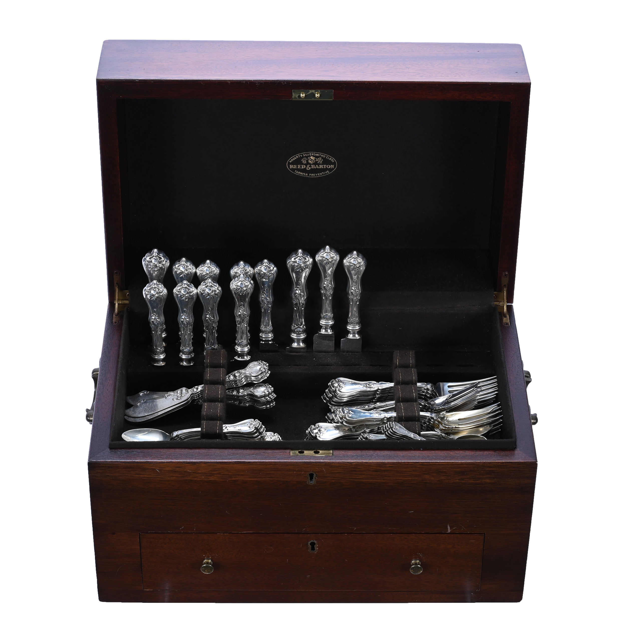 This circa 1905, 140-piece Whiting sterling silver flatware set in the Violet pattern with over 30 specialty pieces, weighing a total of 3575 grams, should change hands for $3,500-$4,500.