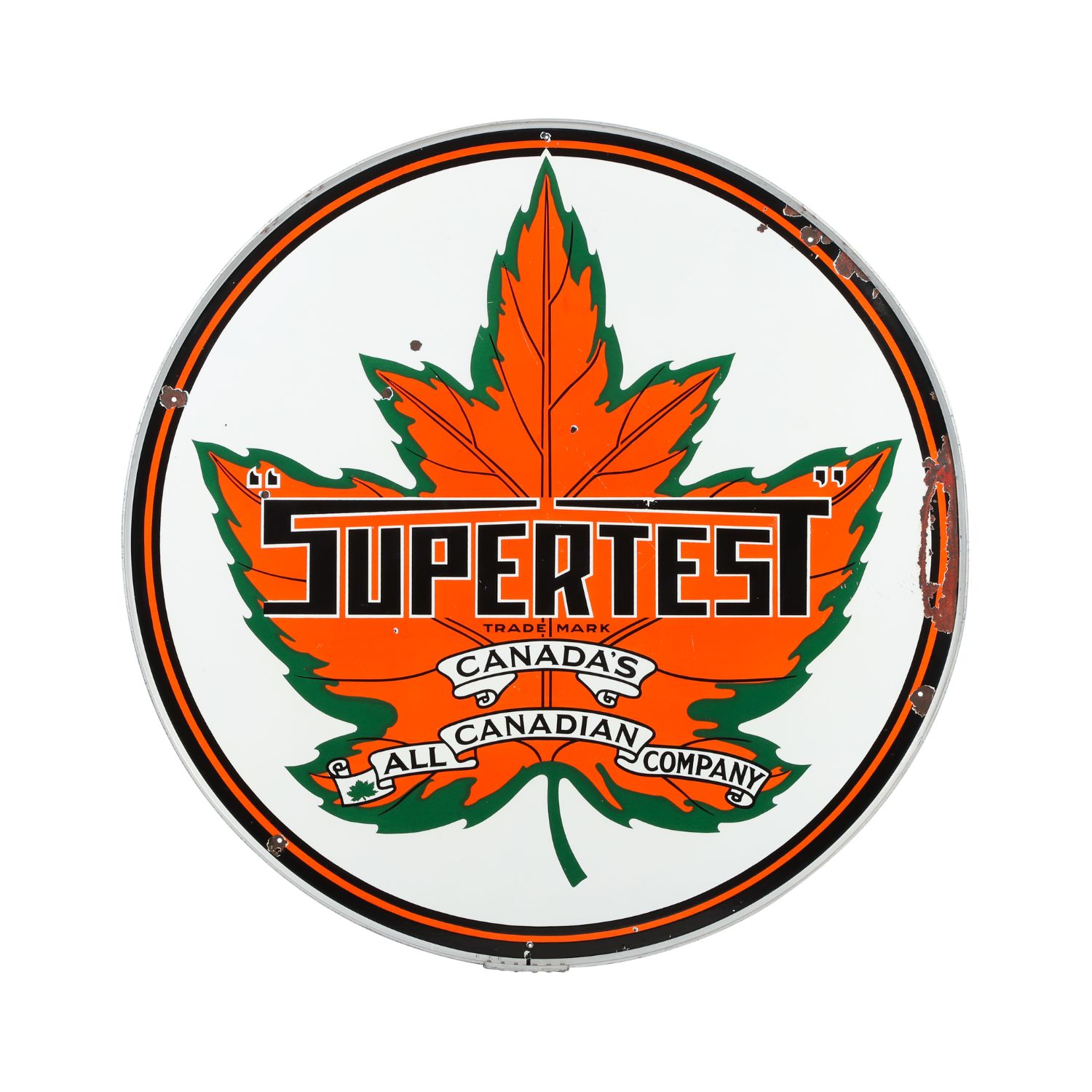 Anchoring the petroliana portion of the sale is an outstanding group of Canadian service-station advertising from the 1920s through the 1940s, prized for bold graphics, scale, and national identity. Lot 1180 is a Canadian 1930s Supertest Gasoline double-sided porcelain sign measuring five feet in diameter, retaining its original aluminum frame and displaying the iconic maple leaf emblem that positioned Supertest as “Canada’s All-Canadian Company.” Authenticated by The Authentication Company and graded 8.5/8.5, the sign carries an estimate of CA$12,000–$15,000.
