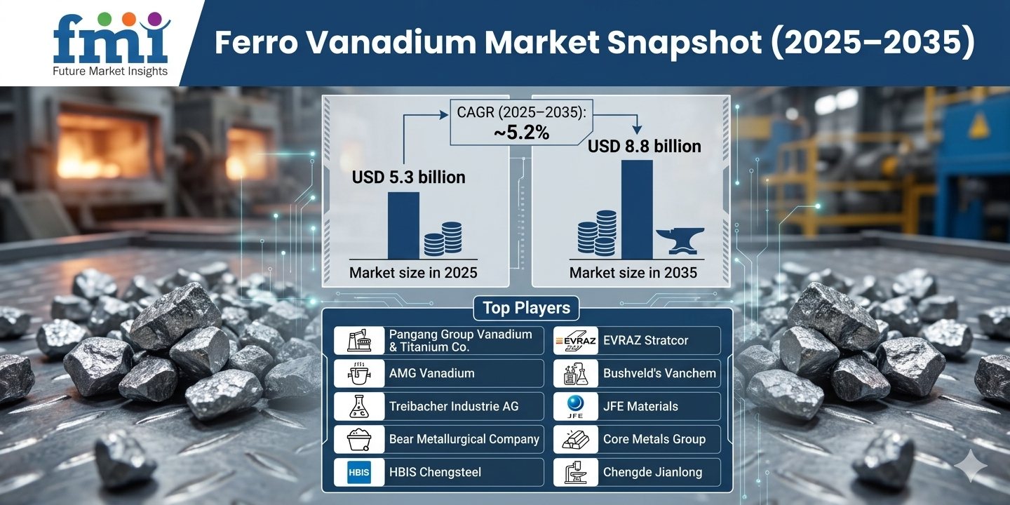NEWARK, DE, UNITED STATES, March 26, 2026 /EINPresswire.com/ -- The global ferro vanadium market is valued at USD 5.3 billion in 2025 and is projected to reach USD 8.8 billion by 2035, expanding at a CAGR of 5.2% over the forecast period. Growth is supported by increasing steel production, widespread adoption of high-strength low-alloy (HSLA) steels, and sustained demand from construction, automotive, and energy industries where vanadium enhances tensile strength, fatigue resistance, and durability.