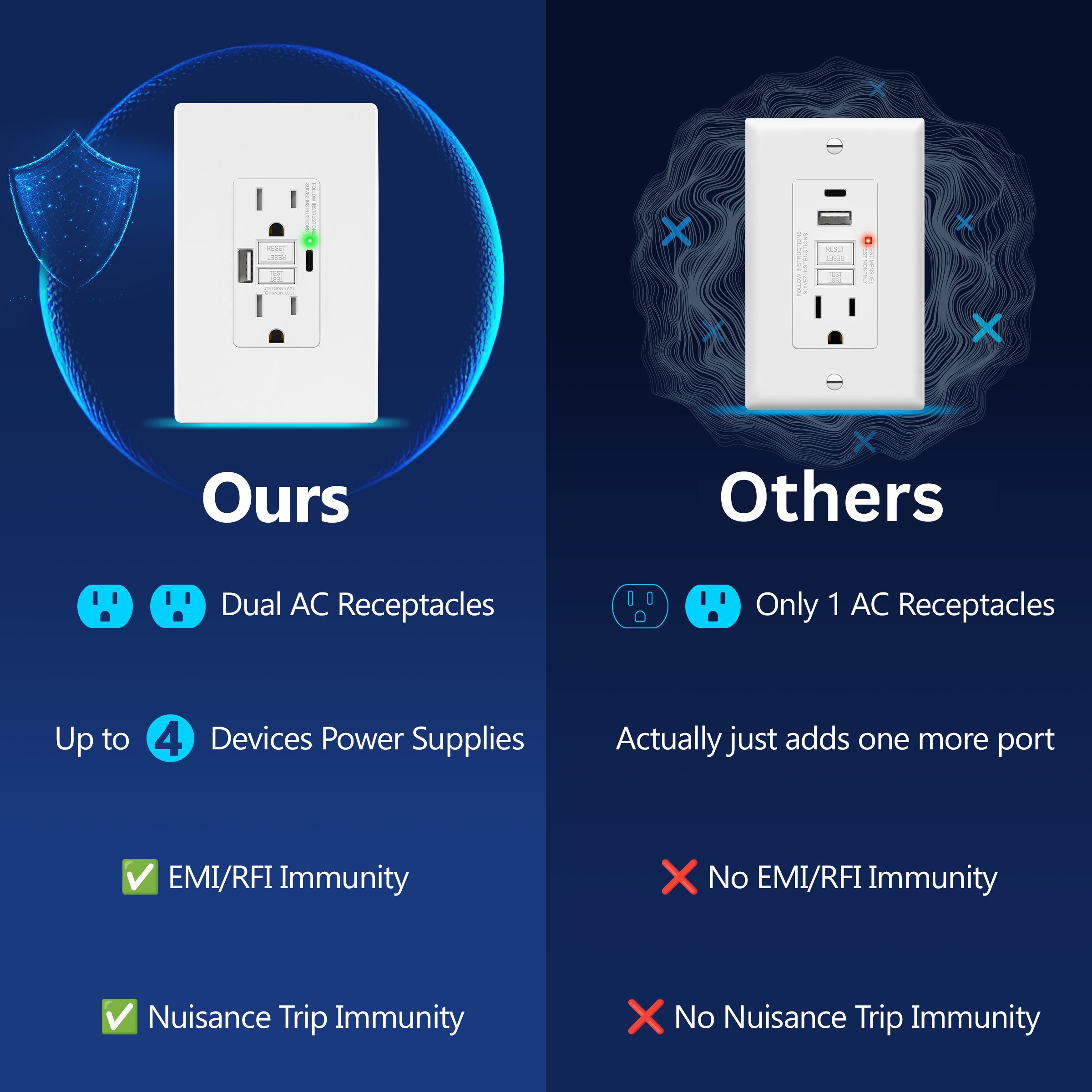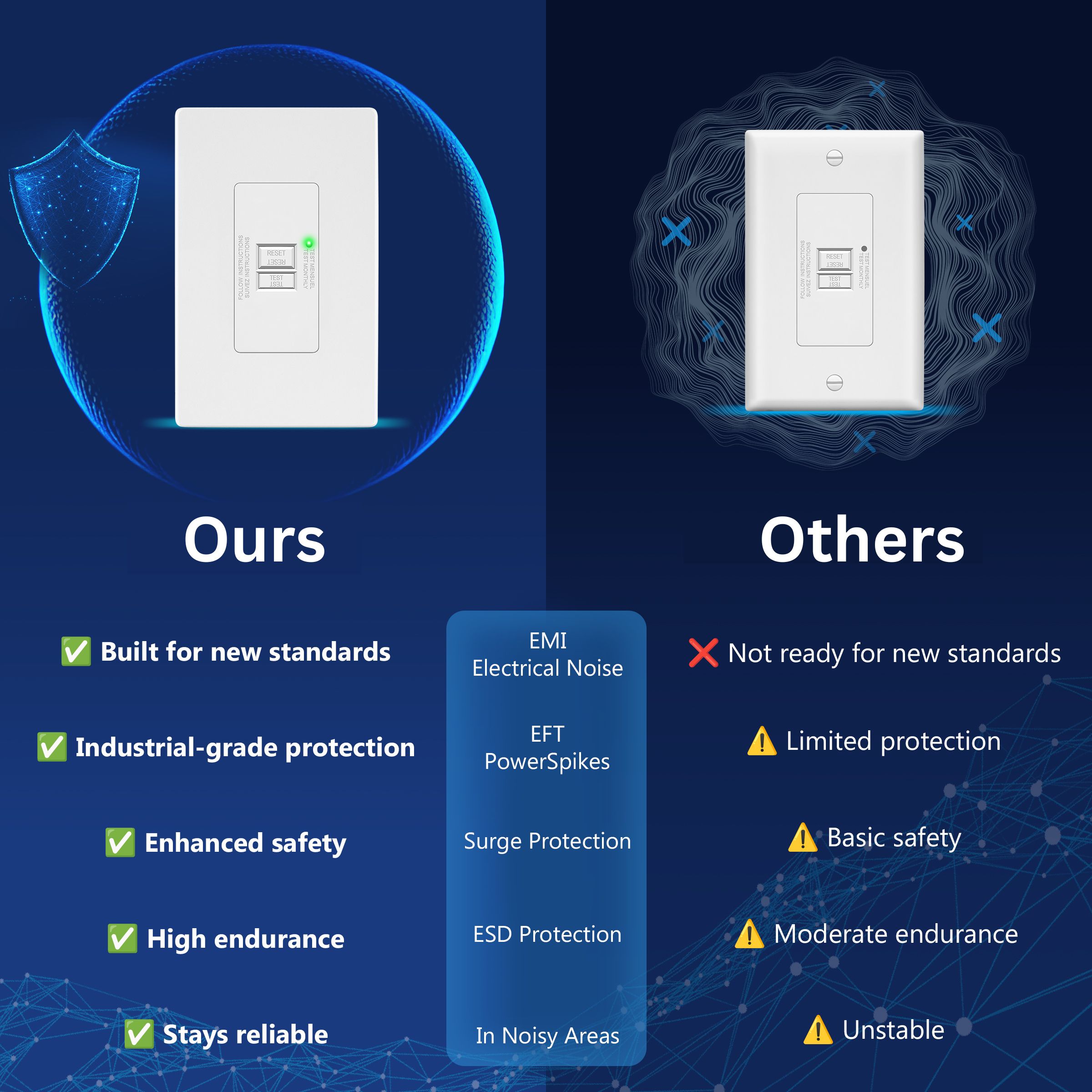 Advanced protection with integrated USB charging, blank face design, 0.025-second response time, and intelligent self-testing technology.